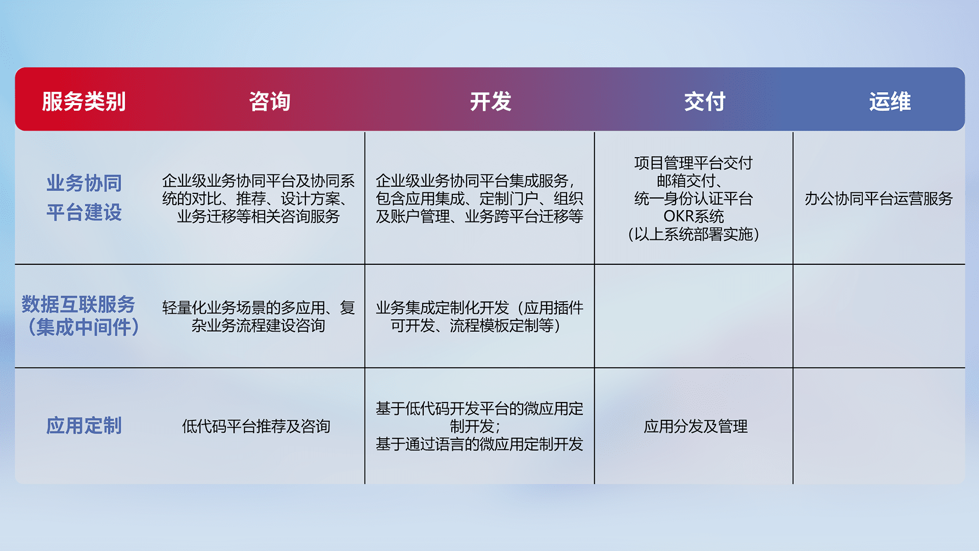 针对钉钉、、、、企微、、、IDaas等平台级产品提供产品的规划、、、、方案、、交付、、、定制化开发等服务,,,实现如统一协同办公、、、、智能客户服务、、、、混合会议管理、、、智能数据查询、、、等业务场景,,,实现数字化转型。。。