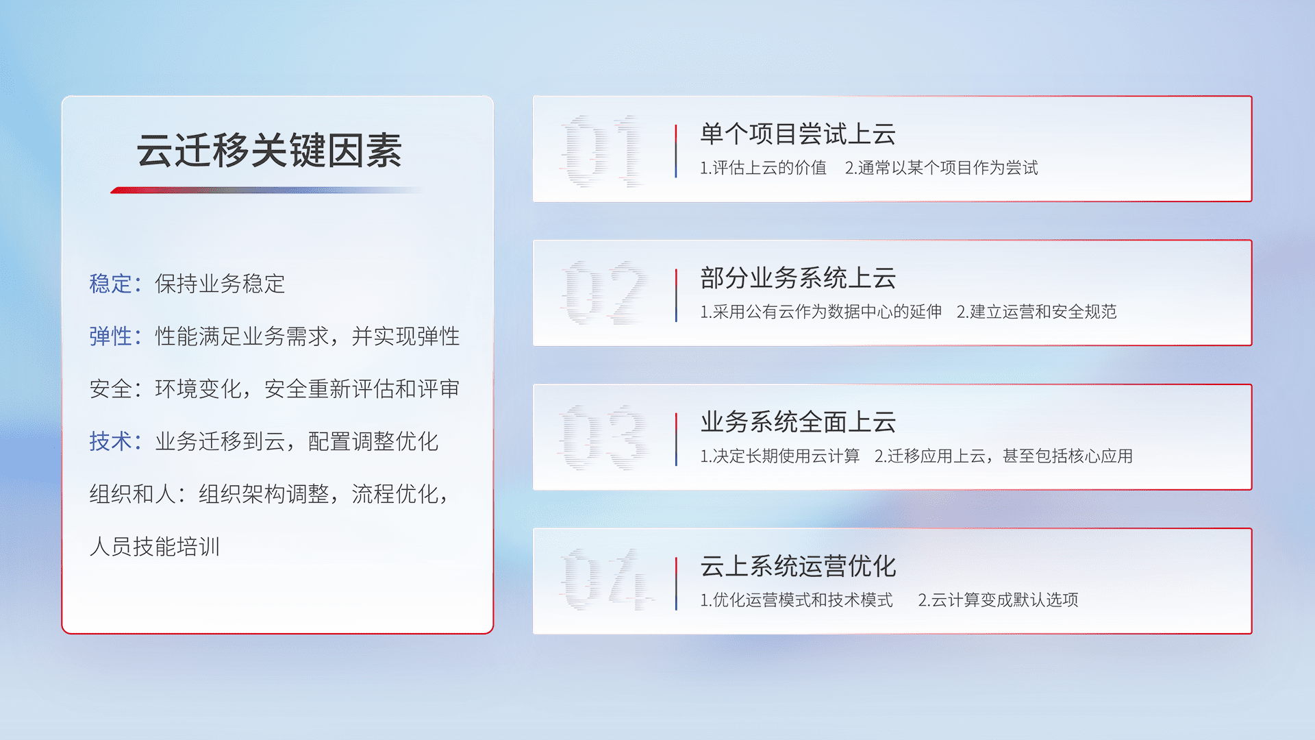 结合实际业务,,从规划设计、、、云平台选型、、、、云原生改造、、数据迁移、、、、集成交付,,迁移全过程为客户识别最佳上云路径,,做好风险识别管理,,设计网络架构、、、身份权限、、安全审计合规、、操作审计、、日志审计、、、监控告警策略、、多站点容灾设计等,,,对云上基础设施进行整体规划,,,提升IT治理水平,,,,以满足弹性、、、、高可用、、、高性能的需求。。。。